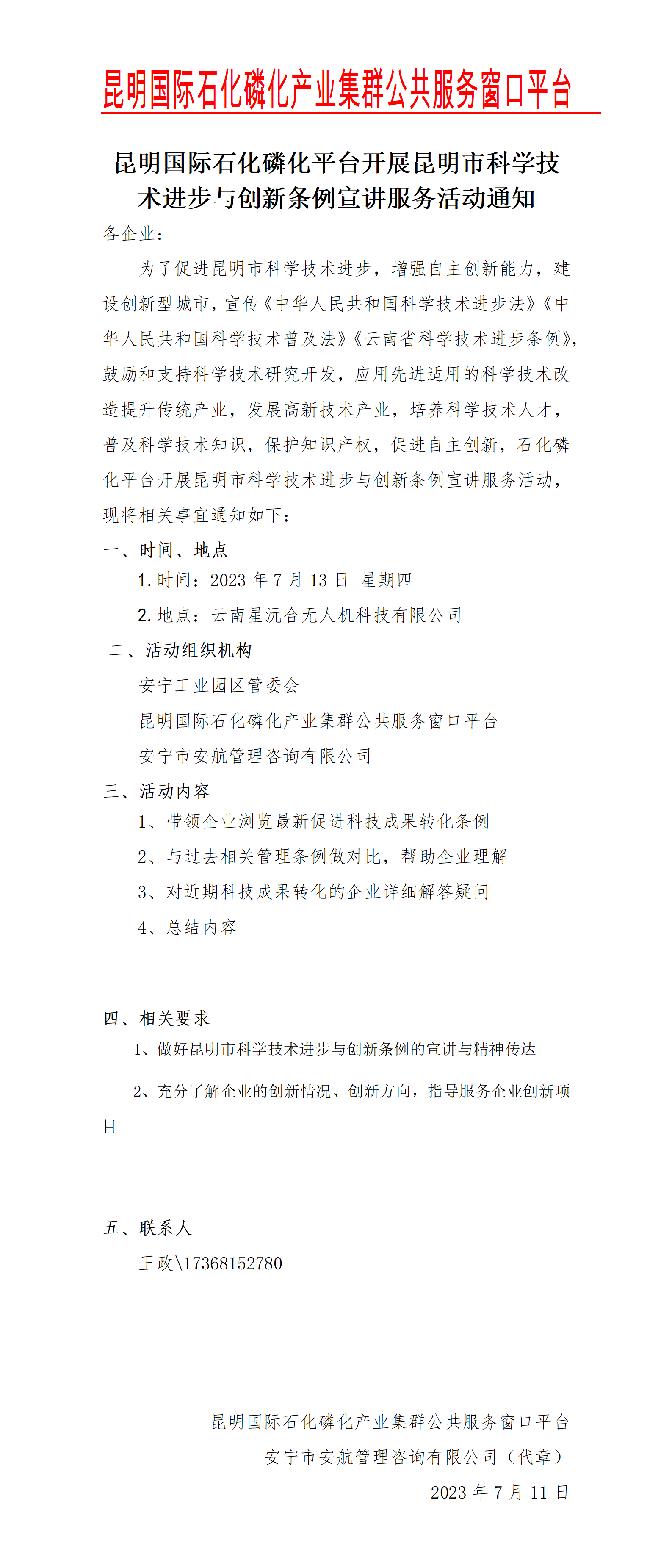 昆明國際石化磷化平臺開展昆明市科學技術進步與創(chuàng)新條例宣講服務活動通知